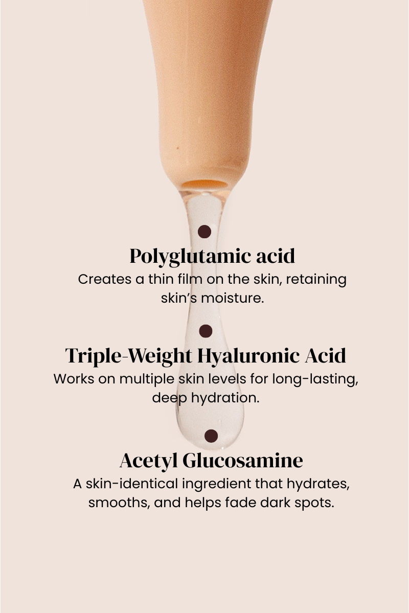 FULL INGREDIENTS LIST: AQUA, BUTYLENE GLYCOL, 2,3-BUTANEDIOL, PENTYLENE GLYCOL, ACETYL GLUCOSAMINE, CARRAGEENAN, HYDROLYZED HYALURONIC ACID, HYDROXYACETOPHENONE, XANTHAN GUM, 1,2-HEXANEDIOL, CAPRYLYL GLYCOL, HYALURONIC ACID, SODIUM POLYGLUTAMATE, SODIUM GLUCONATE, SODIUM HYALURONATE, ALCOHOL, SODIUM HYDROXIDE, TRIS(TETRAMETHYLHYDROXYPIPERIDINOL) CITRATE, ACETOIN.